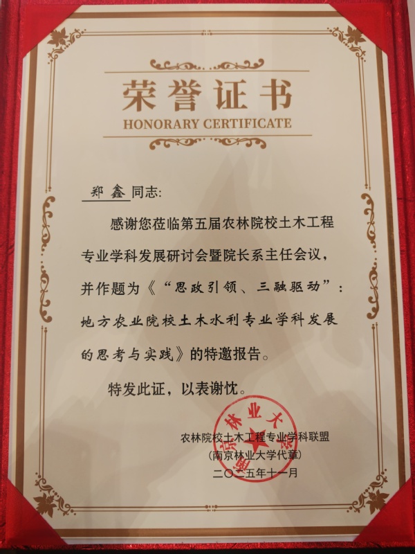 院长郑鑫参加会议并作题为“思政引领、三融驱动-地方农业院校土木水利专业学科发展的思考与实践”的大会报告。在报告中,郑鑫院长介绍了学校、学院的总体情况,深入探讨了如何抓思想引领,推动北大荒精神铸魂育人,以及如何通过“三融驱动”——即产教融合、科创融汇、职普融通——来推动地方农业院校土木水利专业学科的发展。报告得到了与会代表的热烈响应,为地方农业院校土木水利专业学科的发展提供了新的思路和方法。