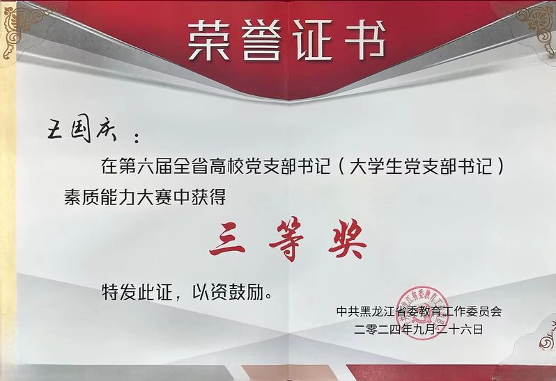 五、繁荣校园文化,促进学生全面成长成才学院着力打造格调高雅、形式多样的校园文化品牌,荣获“校园文化建设先进分团委”称号,路之阳获“校园文化建设优秀指导教师”称号。师生共创的《人世间》音乐MV获2022年冰城高校微视频大赛“最佳短片奖”;网络思政微视频《光》获中国教育电视台三等奖;在第七届全省大学生网络文化节中获三等奖。体育育人成果显著,在黑龙江省学生田径运动会中,取得男子400米第四名、男子4*400米接力比赛第二名、4*400米混合接力第二名、男子4*100米接力第二名、男子三级跳远第一名、男子跳远第三名的好成绩;在2025中俄邀请赛暨第十一届沈阳跆拳道国际公开赛中,我院学子在女子个人品势高丽项目中力拔头筹,勇夺冠军,并在混双项目中斩获亚军;在黑龙江省大学生跆拳道锦标赛中,多名学生荣获踢高、品势等项目前三名,体现了学院学生全面发展的良好态势。