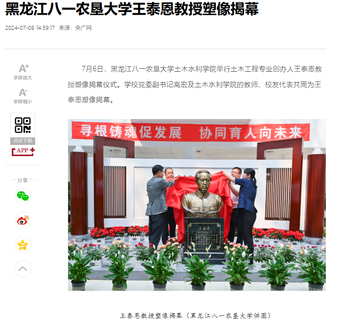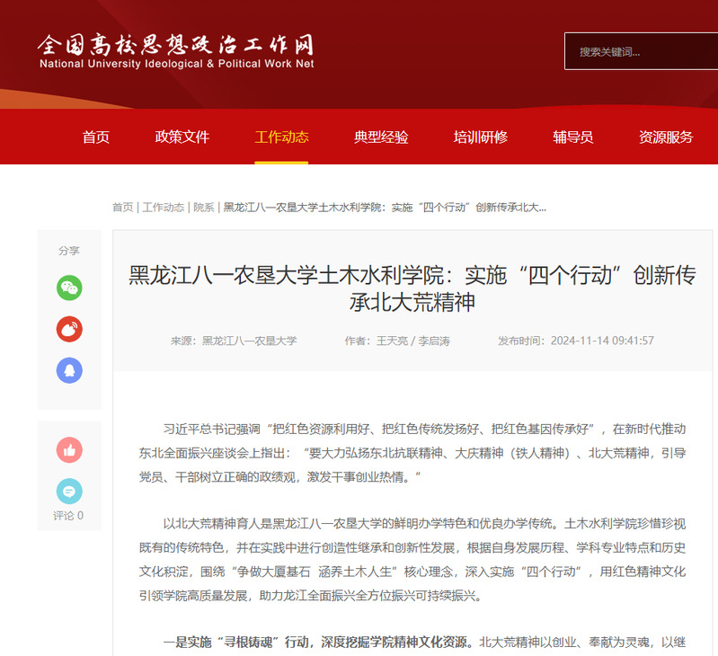 《金沙集团186cc金沙集团186cc实施“四个行动”创新传承北大荒精神》《金沙集团186cc金沙集团186cc积极构建“思政红+科创蓝”学生科技创新工作体系》被全国高校思想政治工作网报道,《金沙集团186cc王泰恩教授塑像揭幕》获央广网关注,党建经验得到权威平台传播。