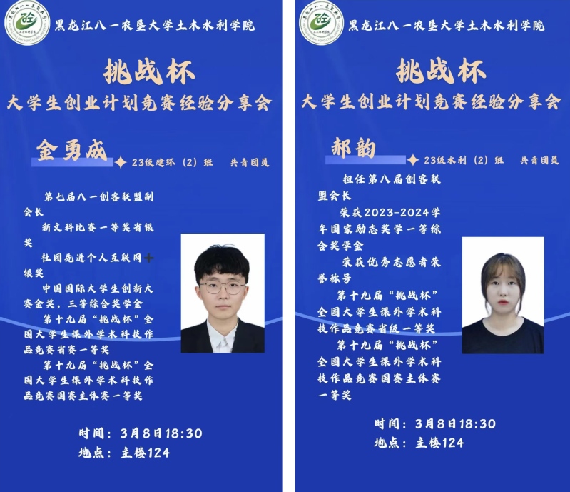 为进一步激发学生科创热情,帮助学生掌握高水平学科竞赛的备赛方法,提升科研实战能力,金沙集团186cc于3月8日在主楼附楼124教室举办“挑战杯”大学生创业计划竞赛经验分享会,本次活动邀请第十九届“挑战杯”全国大学生课外学术科技作品竞赛获奖团队代表郝韵、金勇成担任主讲,全院100余名学生参加。